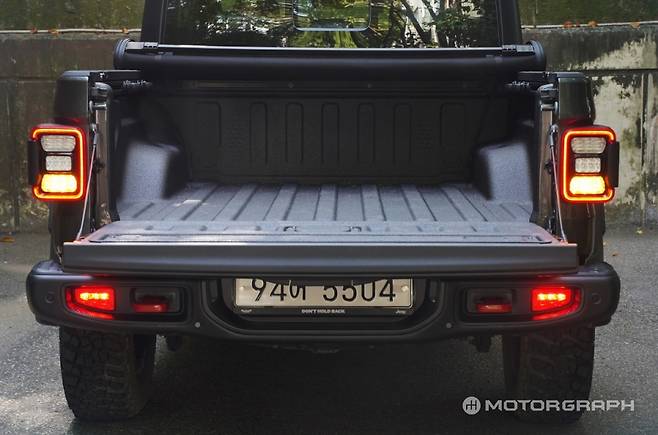 글래디에이터는 용량은 작지만, 활용도를 높이고자 한 노력이 돋보인다. 적재함 우측에 LED 적재함 조명과 230V 파워 아웃렛을 갖췄다. 적재함 조명은 통상적인 후방 안개등 위치에 있는 버튼을 눌러 켜고 끌 수 있게 했다.