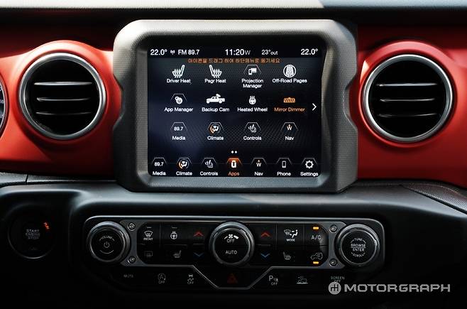 글래디에이터는 8.4인치 U커넥트 시스템이 탑재됐다. 앞서 콜로라도에 적용된 기능 외에도 오프로드 주행 화면과 사용자 기호에 따라 앱 순서를 바꿀 수 있는 기능 등을 별도로 제공한다. 그러나 터치 후 일정 로딩이 있고, 도로 상황을 전혀 고려 않는 TPEG 내비게이션과 오래된 UI 등에 아쉬움이 남았다.