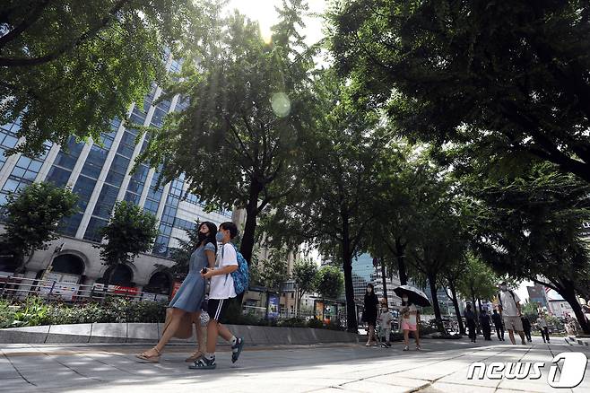 (서울=뉴스1) 황기선 기자 = 장맛비가 소강상태를 보인 11일 오후 서울 광화문광장 인근에서 시민들이 발걸음을 옮기고 있다. 2020.8.11/뉴스1