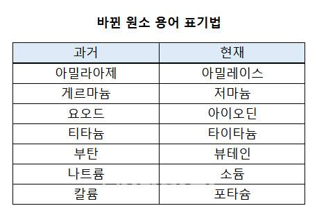 과학 용어는 공용어인 영어를 기준으로 표기하는 추세인데다 일제의 잔재를 청산해야 한다는 다양한 의견이 맞물려 화학 용어 개정이 이뤄졌다. 이에 따라 요오드(iodine)는 아이오딘, 티탄(titanium)은 타이타늄, 게르마늄(germanium)은 저마늄, 부탄(butane)은 뷰테인, 메탄(methane)은 메테인, 망간(Manganese)은 망가니즈로 바꿨다. 이외에도 나트륨은 소듐, 칼륨은 포타슘으로 변경했다.