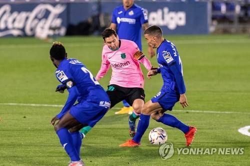epa08754003 FC Barcelona's Lionel Messi (C) in action against Getafe's Mauro Arambarri (R) during the Spanish La Liga soccer match between Getafe CF and FC Barcelona at Antonio Perez Coliseum in Getafe, near Madrid, Spain, 17 October 2020. EPA/Rodrigo Jimenez