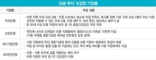 은행권이 선제적으로 미혼 복지를 도입하고 있다. 주요 은행은 최근 노사협의회에서 미혼 직원의 복지를 늘려 달라는 요구에 따라 미혼 직원에게 ‘욜로 비용’을 주거나 (배우자가 아닌) 가족 외 1인의 건강검진 비용을 지원하는 등 사내 복지 변화의 움직임이 감지되고 있다.
