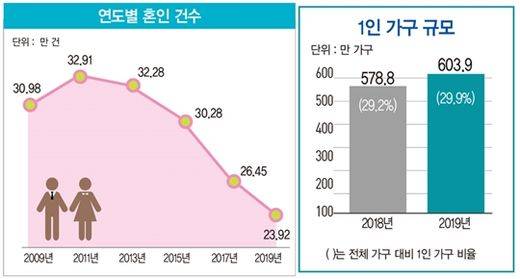 통계청에 따르면 2019년 혼인율은 역대 최저를 기록했다. 지난해 인구 1000명당 혼인 건수를 따지는 조혼인율은 4.7건으로 1970년 통계 작성 이후 사상 최저로 떨어졌다. 통계청은 인구 감소에다 결혼을 기피하는 현상이 겹치면서 혼인이 줄어들고 있다고 설명했다.
