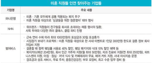 미혼에 특화한 복지 제도는 아니지만 미혼 직원의 연애와 결혼을 장려하는 행사를 상시로 진행하는 기업들도 있다. 미혼자들의 만남을 주선해 주거나 결혼 정보 회사 가입비를 지원하는 것이 대표적이다. 하나은행은 지난해 사내 미혼자들을 위해 ‘싱글들을 위한 청춘열차’라는 테마 행사를 기획해 미혼 직원들에게 네트워킹 기회를 제공했다.