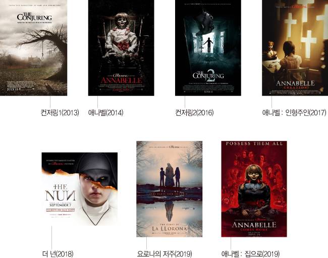 ‘컨저링 유니버스'는 컨저링1(2013)-애나벨(2014)-컨저링2(2016)-애나벨:인형주인(2017)-더 넌(2018)-요로나의 저주(2019)-애나벨:집으로(2019) 등 총 7편이다. 그 중심에는 제목처럼 컨저링1·2가 있다(9월 11일 개봉 예정이던 '컨저링3'는 코로나19 영향으로 개봉 일정을 2021년 6월 4일로 연기했다). 뒤 이은 작품들은 '컨저링1' 영화의 배경 시점인 1971년을 기준으로 '프리퀄'(전작보다 과거 시점을 다루는 후속작)로 움직이는데, 모든 영화의 배경 시점은 1863~1977년 사이다. 장소 또한 루마니아의 으슥한 산골, 미국 전역, 영국 런던 주택가 등 동서를 횡단한다.