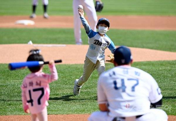 3일 창원 NC파크에서 ‘2020 신한은행 SOL KBO리그’ NC 다이노스와 삼성 라이온즈의 DH1차전 경기가 열렸다. 경기에 앞서 ‘플레이어데이’에 선정된 NC 나성범이 시포, 딸 하늬양이 시타, 아들 정재군이 시구자로 나서고 있다.