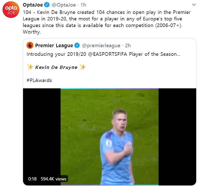 영국 통계 매체 '옵타'는 16일, 공식 트위터를 통해 "케빈 데 브라이너는 2019/20시즌에 104회의 찬스를 만들었다(오픈 플레이 상태에서)"며 "이는 옵타가 축구 통계 자료를 수집한 2006/07시즌 이후 프리미어리그에서 한 시즌 최다 기록이다"라고 전했다.