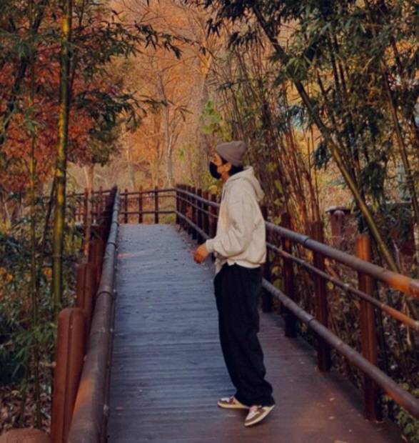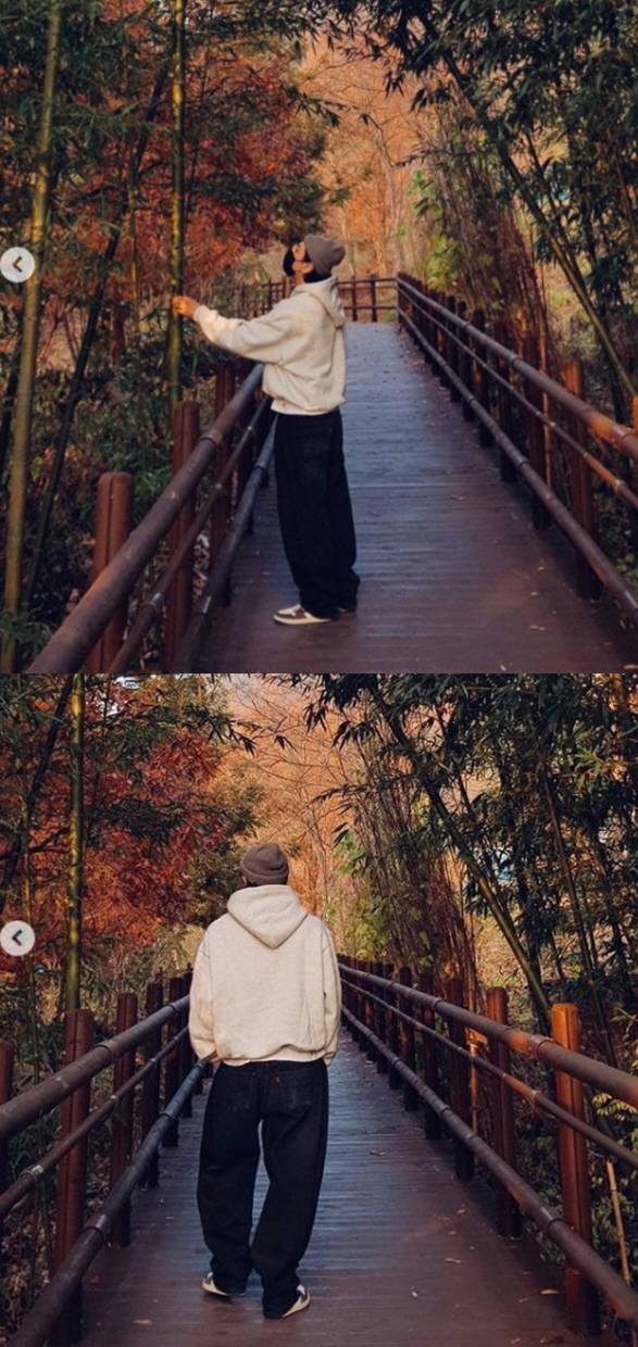 공개된 사진 속 박효신은 단풍나무가 울창한 아름다운 길에서 포즈를 취하고 있다.