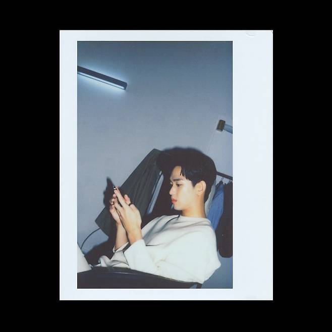 사진 속 김수현은 흰색 스웨트셔츠 차림으로 휴대폰을 만지작거리고 있다.