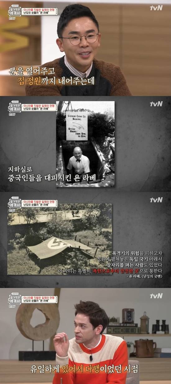 이어 "욘 라베는 당시 독일이 일본의 동맹국이라 자신이 다칠 위험이 없다고 생각했다. 그래서 외국인들을 모아 국제위원회를 조직했고, 자신의 방공호에 중국인들을 숨겨줬다. 사람들이 모이기 시작하자 집 정원까지 내줬다. 폭탄의 위협이 있었지만 안전했던 이유는 사람들로 나치 문양을 만들었기 때문이었다. 하켄크로이츠를 이용해서 중국인들 구했다"고 말했다.