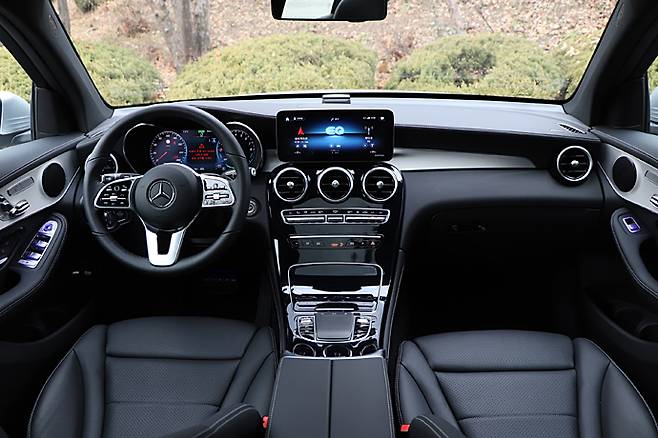 올 초 출시된 GLC 부분 변경 모델은 라디에이터 그릴 가운데 두 개의 가로바의 패턴에 변화를 주고 LED고성능 헤드램프의 그래픽을 달리하는 것만으로 좀 더 엣지있는 느낌을 만들고 있다. 헤드램프가 새로운 크롬라인이라고 하는 인식이 등장한 지 적지 않은 시간이 지났지만 크지 않은 헤드램프의 변화가 시선을 잡는 것은 분명하다. 범퍼 아래쪽의 에어 인테이크 프레임과 에어 스커트의 그래픽 변화도 메르세데스로서는 적지 않은 변화다.