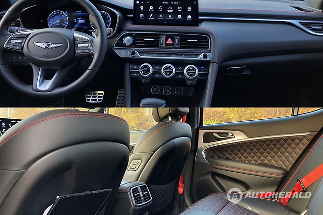 대형 '크레스트 그릴'은 브랜드의 존재감을 과시하고 대각선으로 배치된 두 줄 '쿼드램프'는 차체를 더욱 낮고 와이드한 모습으로 안정적 자세를 연출한다. 무엇보다 사진으로 봤던 것과는 확연히 다른 실제 도로 위 더 뉴 G70 존재감은 여는 제네시스 라인업 상위 차종과도 구별되는 독창적 이미지를 띠었다.