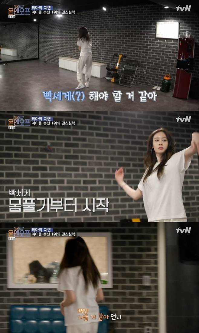 배윤정은 문을 열자마자 "야 때려치워"라고 폭풍 잔소리를 했고 지연은 폭소했다. 지연은 "배윤정과는 중학생 때부터 알던 사이다"고 설명한 뒤 일대일 맞춤 레슨을 받았다.(사진=tvN '온앤오프' 캡처)