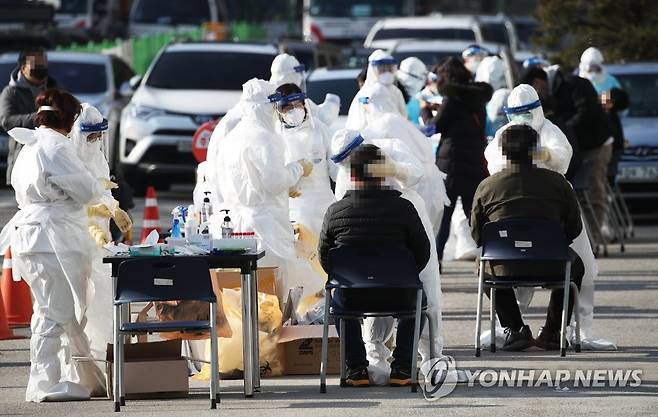 (성남=연합뉴스) 홍기원 기자 = 신종 코로나바이러스 감염증(코로나19) 확진자가 발생해 폐쇄된 경기도 성남시 분당구청에 설치된 임시 선별진료소에서 25일 오전 구청 근무자 531명에 대한 전수검사가 진행되고 있다. 2020.11.25