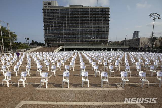 7일(현지시간) 이스라엘 텔아비브 라빈 광장에 코로나19로 숨진 사람을 상징하는 의자 천 개가 놓여 있다.