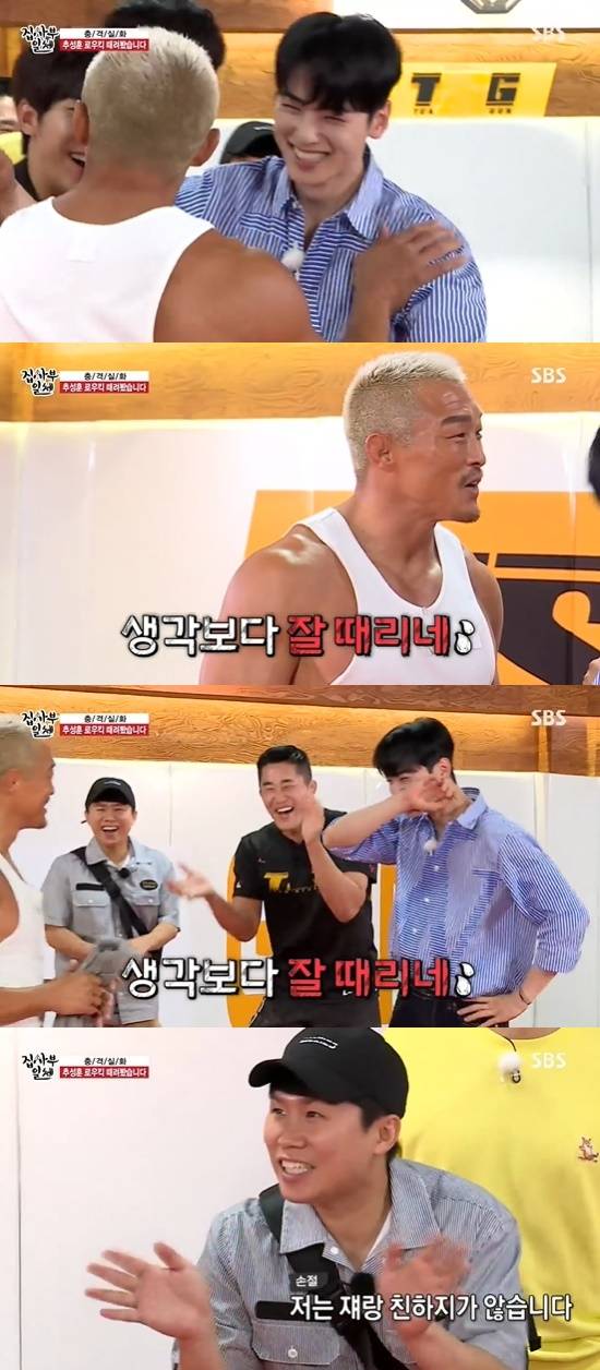 차은우는 민망해하며 추성훈에게 안겼고, 추성훈은 "생각보다 잘 때리네"라고 밝혔다.