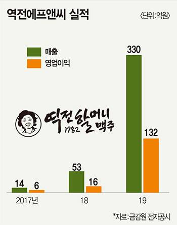 외식업 프랜차이즈 브랜드의 개업 후 1년 차 대비 개업 3년 차 평균 생존율이다. 이런 와중에 2016년 첫 프랜차이즈 사업 시작 후 5년 만인 최근 8월 600호점을 달성한 곳이 있다. 게다가 한 곳도 폐점하지 않았다. 매출액과 영업이익 추이는 더욱 놀랍다. 2017년만 해도 매출액 14억원, 영업이익 6억원이었던 회사가 지난해 매출액 330억원, 영업이익 132억원으로 훌쩍 성장했다. 영업이익률이 40%에 육박한다. ‘역전할머니맥주’를 주력으로 하는 역전에프앤씨 얘기다.