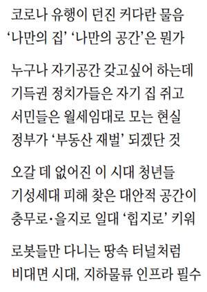 ▷자기만의 공간을 소유할 수 없다는 절망, 소유한 공간마저 침해당할 수 있다는 불안이 그만큼 커져서다. 집 없는 사람은 언젠가 가질 수 있어야 하는데 그럴 기회가 사라지고 있다. 사람은 나의 집, 나만의 공간을 소유해야 안정감을 느낀다.