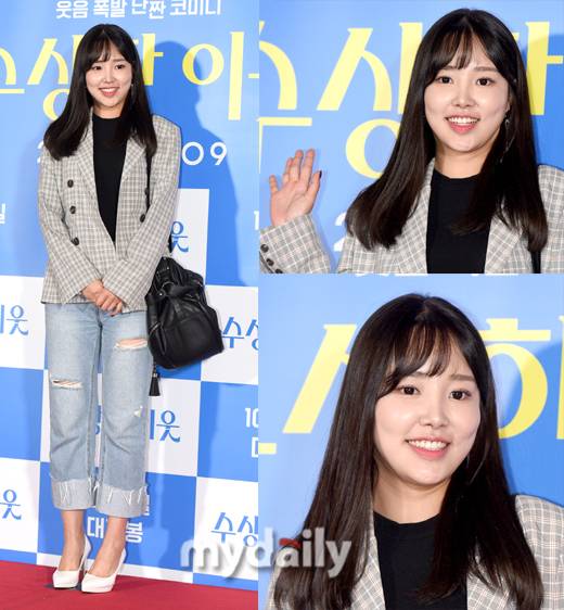 가수 김맑음이 2019년 9월 25일 서울 자양동 롯데시네마에서 영화 수상한 이웃 VIP 시사회에 참석해 포토월에서 포즈를 취하고 있다.