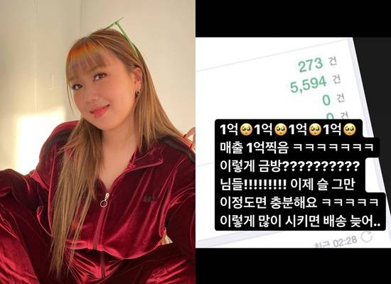 여기에서 그치지 않고 금방 매출 1억을 달성하기도 했다. 이영지는 매출을 공개하며 "이렇게 금방???이정도면 충분해요. 이렇게 많이 시키면 배송 늦어..."라며 당황스러움을 감추지 못했다.