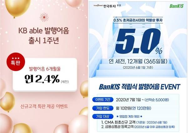 한국투자증권은 지난 15일부터 비대면·은행 계좌 개설 서비스인 뱅키스(BanKIS) 고객을 대상으로 연 5%이자를 주는 적립식 발행어음을 팔고 있다. 1년 만기로 월 최대 10만원씩 불입할 수 있다. 가입 대상은 6월 1일 이후 한국투자증권 종합자산관리계좌(CMA)를 최초로 개설하거나 한국투자증권 온라인 금융상품권을 등록한 뱅키스 고객이다.