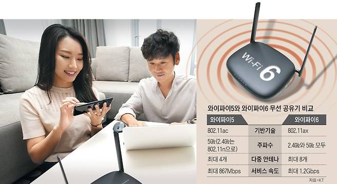 KT와 SK브로드밴드, LG유플러스 등 국내 통신회사들이 ‘와이파이6’급 가정용 무선 공유기 출시 경쟁에 뛰어들었다. 와이파이6는 미국 전기전자학회(IEEE)의 최신 무선 네트워크 표준 기술인 ’802.11ax'에 기반했다. 기존 와이파이5 제품보다 40% 이상 빠른 초당 1.2기가비트(Gbps)의 속도를 낼 수 있다. 4K급의 초고화질 온라인 동영상이나 대용량 온라인 게임을 즐기기에 보다 적합하다. KT에 이어 LG유플러스가 와이파이6 무선 공유기 제품을 내놓았고 SK브로드밴드도 곧 비슷한 사양의 제품을 내놓을 예정이다. 통신업체들은 “신종 코로나로 인한 비대면 문화 확산으로 집에서 스마트폰과 태블릿PC, 노트북PC 등 다양한 기기를 이용해 온종일 인터넷에 접속하는 일이 흔해지면서 더 안정적인 무선 인터넷 접속 환경과 빠른 속도까지 누릴 수 있는 와이파이6 공유기에 대한 수요가 높아지고 있다”고 설명한다.
