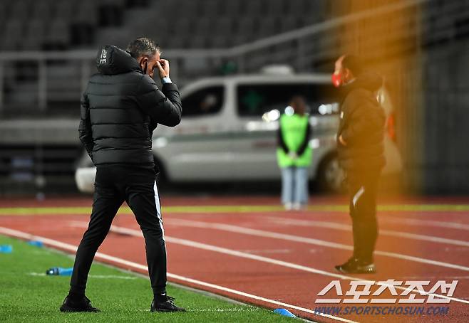 축구국가대표팀과 올림픽대표팀의 스페셜매치 2차전이 12일 오후 고양종합운동장에서 열렸다. 국가대표팀 파울루 벤투 감독이 생각에 잠겨 있다. 고양=박재만 기자 pjm@sportschosun.com/2020.10.12/