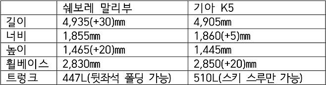 두 차 모두 중형급에 걸맞은 크기다. 차체 길이×너비×높이는 말리부가 4,935×1,855×1,465㎜, K5는 4,905×1,860×1,445㎜다. 말리부가 약간 길고 높다. 너비는 K5가 근소하게 크다. 실내 공간 좌우할 휠베이스 또한 K5가 2,850㎜로 말리부보다 20㎜ 더 넉넉하다.