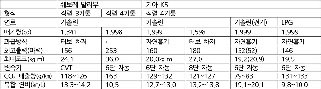 참고로 모든 말리부 라인업에는 R-타입 스티어링 시스템을 넣는다. 반면, K5는 1.6L 터보 모델에만 들어간다.