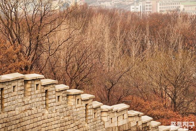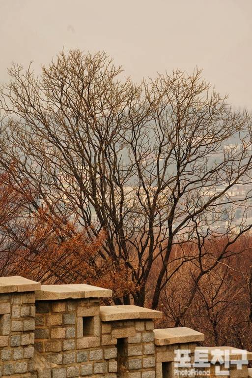 서울 낙산공원의 성곽 너머로 잔 가지를 드러낸 겨울나무들의 실루엣이 멋집니다.