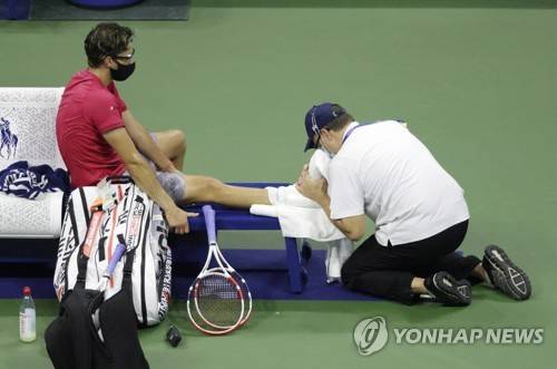 epa08662915 Dominic Thiem of Austria receives medical treatment as he plays Daniil Medvedev of Russia during their Men's Semifinal match on the twelfth day of the US Open Tennis Championships the USTA National Tennis Center in Flushing Meadows, New York, USA, 11 September 2020. Due to the coronavirus pandemic, the US Open is being played without fans and runs from 31 August through 13 September. EPA/JASON SZENES