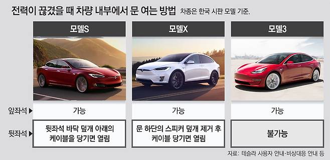 국내에서 판매되고 있는 또 다른 차종인 모델X와 모델S 역시 뒷좌석 탈출이 어렵게 설계돼 있다. 전력이 끊기면 모델X는 뒷문 아랫부분 스피커 덮개를 제거한 뒤 케이블을 당겨야 하고, 모델S는 뒷좌석 바닥 덮개를 젖혀 케이블을 당기도록 돼 있다. 사고 등 긴박한 상황에서 대응하기 어려운 구조다. 국내 시판 중인 3종 모두 전력이 끊기면 밖에서는 아예 뒷문을 열 수 없다.