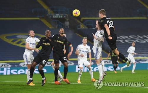 epa08878168 Tomas Soucek of West Ham (R) scores his team's opening goal during the English Premier League soccer match between Leeds United and West Ham United in Leeds, Britain, 11 December 2020. EPA/Oli Scarff / POOL EDITORIAL USE ONLY. No use with unauthorized audio, video, data, fixture lists, club/league logos or 'live' services. Online in-match use limited to 120 images, no video emulation. No use in betting, games or single club/league/player publications.
