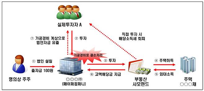 다주택자인 A씨가 주택을 직접 취득했을 경우 종합부동산세·양도소득세 중과로 세부담이 급증하고, 부동산 사모펀드에 직접 투자했을 경우에도 고세율의 배당소득세를 부과받을 상황이었다. 그러나 A씨 대신 페이퍼 컴퍼니가 배당수익을 올려 적용세율을 1차로 낮추고, 페이퍼 컴퍼니의 수익 역시 경비로 결손처리하며 자금을 유출하는 방식으로 2차 조세회피가 이뤄졌다. 이에 국세청은 경비 결손처리 등의 혐의에 대한 전격조사에 착수할 예정이다.