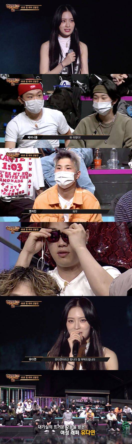 남성 래퍼들은 일순간 유다연에게 시선을 고정시켰다. 머쉬베놈은 유다연을 제대로 보기 위해 안경을 고쳐 쓰는 시늉을 해 웃음을 자아냈다. 유다연이 인사만 해도 대기실에서는 열띤 호응이 쏟아졌다.