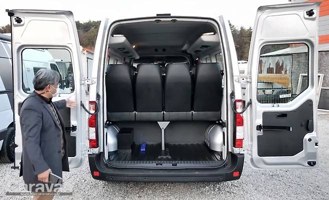 후면부의 시트 뒤로 넓고 높은 적재공간이 마련되어 있어 승객들의 대형 캐리어를 수납할 수 있고 좀 더 자세히 살펴보면 측면까지 270도로 활짝 열리던 도어의 각도가 180도로 고정되어 다름을 느낄 수 있다. 전체 외관이 패널로 덮혀있고 1,100kg의 적재량을 보이는 10.8㎥의 공간 대신에 12명을 위한 시트가 2-3-3-4 구성으로 배치되어 있다. 운전석의 3열 시트는 공통이지만 격벽이 없어 좀 더 시원스럽다.
