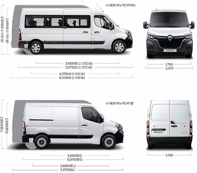 르노 마스터 13인승, 15인승 미니버스에서 유독 15인승 모델이 주목받는 데에는 사이즈에 대한 경쟁력과 가성비, 실내의 구성, 내구성, 휠베이스 등의 사이즈에 대한 장점을 빼놓으면 다른 부분은 밴 타입과도 거의 동일한 성능을 보이게 된다. 르노 마스터에 대한 이야기를 시작하려면 르노 마스터 라인업의 수많은 레이아웃과 스펙, 사이즈를 먼저 이해해야 한다.