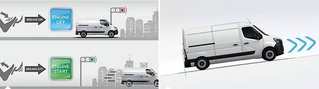 르노 마스터의 연비와 정숙성에 있어 엔진 스탑앤고 시스템은 중요한 역할을 하고 있다. 브레이크를 밟으면 자동으로 엔진이 멈추고 브레이크에서 발을 떼면 곧바로 출발할 수 있지만 예전에 가졌던 수동 기어, 언덕 밀림을 걱정하여 반클러치를 쓰는 상황은 걱정에 불과한 일이다. 언덕길에서 힐어시스트가 작동하여 좀 더 여유롭게 악셀러레이터로 이동할 수 있다.