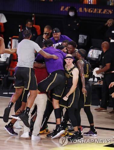 epa08685460 Los Angeles Lakers players mob Anthony Davis (C) after Davis scored a buzzer-beater over Denver Nuggets center Nikola Jokic to win their NBA basketball Western Conference finals playoff game two at the ESPN Wide World of Sports Complex in Kissimmee, Florida, USA, 20 September 2020. EPA/ERIK S. LESSER SHUTTERSTOCK OUT