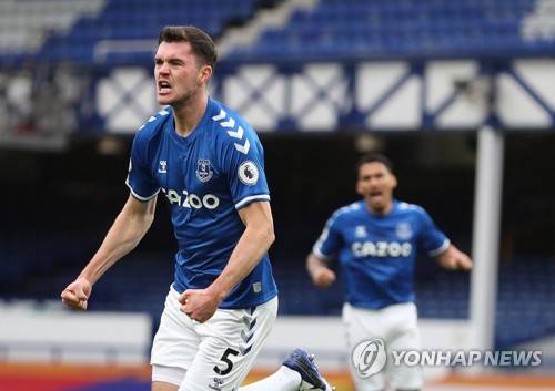 epa08752427 Michael Keane of Everton celebrates scoring his team's opening goal during the English Premier League match between Everton and Liverpool in Liverpool, Britain, 17 October 2020. EPA/Cath Ivill / POOL EDITORIAL USE ONLY. No use with unauthorized audio, video, data, fixture lists, club/league logos or 'live' services. Online in-match use limited to 120 images, no video emulation. No use in betting, games or single club/league/player publications.