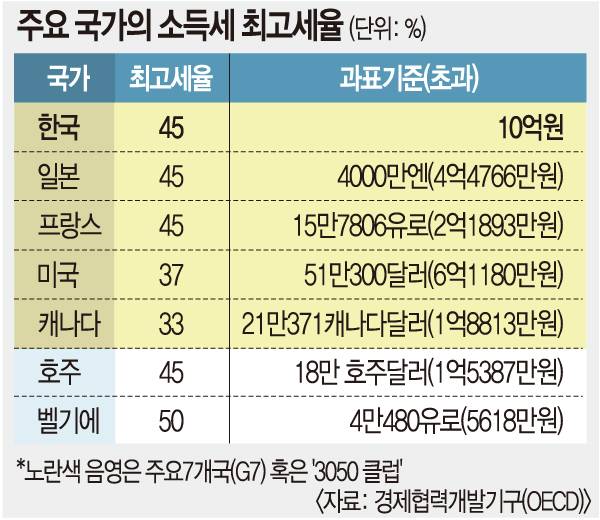 정부가 예고한 대로 올해 소득세 최고세율을 45%로 개정하면 일본, 독일, 영국, 프랑스와 함께 '3050클럽(국민소득 3만 달러 이상·인구 5000만명 이상 국가)'에서 최고 수준이 된다.