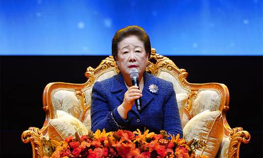 | 인사말 하는 한 총재 세계평화통일가정연합 한학자 총재가 지난 10일 열린 ‘천보대축제’에서 인사말을 하고 있다. 가정연합 제공 |