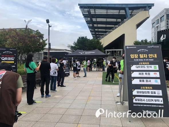 성남-서울 경기를 보러 탄천종합운동장을 찾은 K리그 팬들은 잔뜩 상기된 표정으로 게이트에서 줄을 섰다. W석, E석 게이트에는 안내 배너가 홈팬들을 반기고 있었다. 이들은 최소 1m 이상 거리를 두고 경기장 입장을 대기했다. 또한 게이트에서 체온 측정과 QR코드 인증에 적극 동참했다.