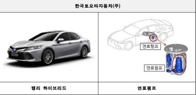 한국토요타자동차에서 판매된 캠리 하이브리드 등 24개 차종 1만5024대는 연료펌프 내 일부 부품의 결함으로 연료펌프가 작동되지 않아 주행 중 시동이 꺼질 가능성이 확인됐다. 해당 차량은 24일부터 한국토요타자동차 공식서비스센터에서 무상으로 수리를 받을 수 있다.