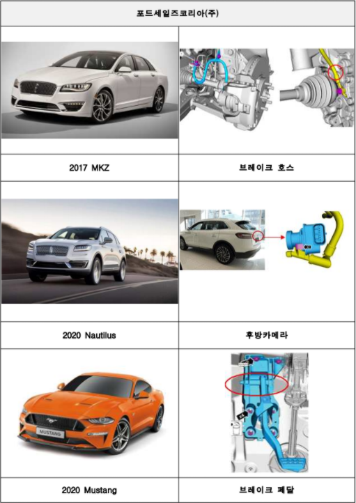포드코리아에서 수입한 머스탱 808대에서는 브레이크 페달 부품 내구성 부족과 노틸러스·머스탱 일부 차종 569대에서는 후방 카메라 부품 접촉 불량이 확인돼 리콜을 실시한다. 머스탱과 노틸러스는 12월 4일부터 무상 리콜을 진행중이며 MKZ 등 4개 차종은 오는 11일부터 공식 서비스센터를 통한 리콜을 진행한다.