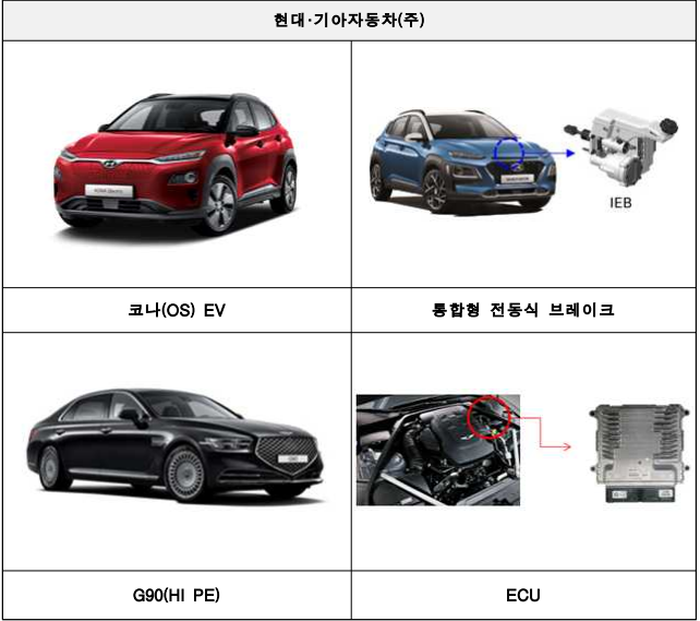 현대·기아차에서 판매한 코나 전기차(EV)와 하이브리드(HEV), 넥쏘, 쏘울은 전동식 브레이크 시스템의 소프트웨어 결함이 발견됐다. 브레이크 경고등 점등시 브레이크 페달이 무거워져 제동이 제대로 되지 않을 가능성으로 인해 4개 차종 5만2759대가 오는 9일부터 현대·기아차 서비스센터를 통해 무상 리콜을 진행한다.