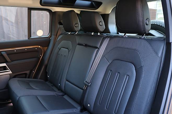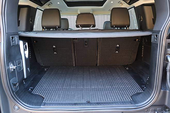 리어 시트는 40 : 60 분할 접이식이 표준. 시승차는 옵션인 40 : 20 : 40 방식이다. 2열 시트의 쿠션을 들어 앞쪽으로 세우고 시트백을 접으면 풀 플랫이 된다. 눈길을 끄는 것은 또 하나의 디펜더의 아이콘이라고 할 수 있는 지붕의 측면 모서리에 있는 슬림한 채광창이다. 실제로 캠핑이라든지 와일드 라이프를 즐기는 사용자들에게는 색다르게 느껴질 수 있을 것 같다. 트렁크 플로어 커버를 열면 스페어타이어는 없고 커다란 수납공간이 마련되어 있다.