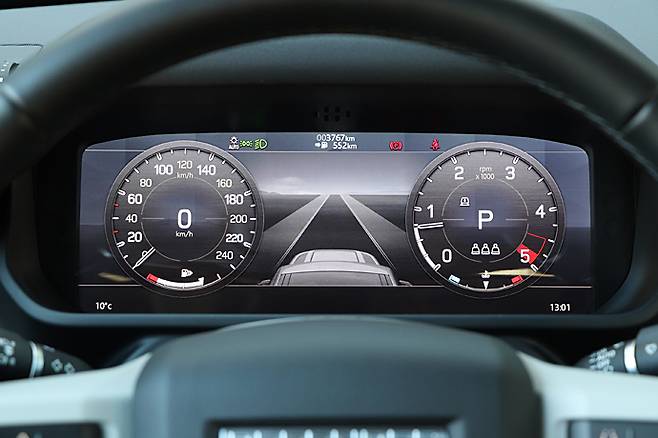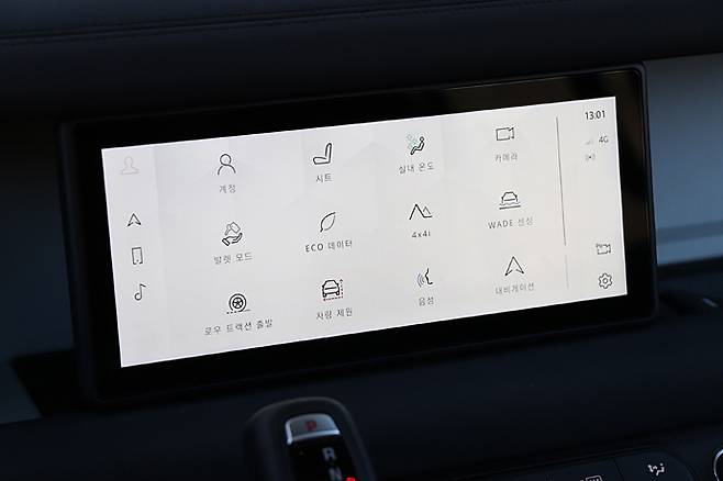 인테리어의 기조도 수평과 수직의 조형이다. 기존 모델과는 전혀 다른 그래픽이지만 신세대 랜드로버 모델들보다 더 간결하고 모던한 느낌이 강하다. 스티어링 휠 뒤의 12.3인치 계기판과 센터페시아의 10인치 터치스크린 디스플레이, 그리고 그 아래 공조 시스템 컨트롤 패널 등 모두가 디지털 장비이다. 터치스크린의 감도가 기존 모델들보다는 크게 좋아졌다. 특히 에어컨의 왼쪽 다이얼은 터레인 리스폰스의 조작 스위치 역할까지 겸하고 있는 것이 또 한 단계의 진화를 엿보게 한다.