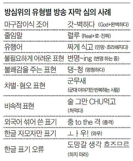 의사소통을 해치는 자막들을 막기 위해 정부가 ‘방송심의에 관한 규정’을 따로 두고 방송언어 사용 실태를 방송 평가에 반영하고 있지만 역부족이다. 지난 10월 방송통신심의위원회 방송심의소위원회가 ‘노우 The 뼈’ ‘아이크은랩벋아돈노더ㄹㄹㄹ랩’, ‘Pa스Ta’, ‘허(oOo)엌’ ‘짜치니까(?!?!)’ 등을 사용한 MBC ‘놀면 뭐하니' 등 7개 프로그램에 대해 법정제재인 ‘주의’를 의결하자 방송 종사자들 반발이 컸다.