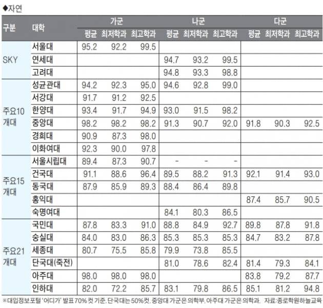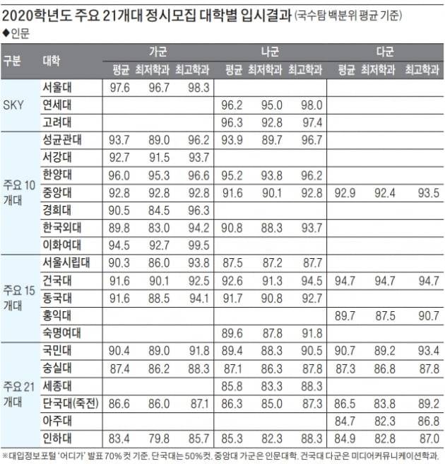 ‘어디가’를 통해 발표된 2020학년도 주요 21개 대학의 정시모집 입시 결과(최종 등록자의 상위 70% 커트라인)를 살펴보면, SKY권 인문계열의 국수탐 백분위 평균은 대학별로 96.2~97.6으로 나타났다. 자연계열은 94.7~95.2로 나타났다. 대학별로 보면 서울대 인문계열의 국수탐 백분위 평균은 97.6(학과별 96.7~98.3)으로 나타났고, 서울대 자연계열은 95.2(학과별로 92.2~99.5)를 기록했다. 연세대 인문은 평균 96.2(95.0~98.0), 연세대 자연은 평균 94.7(93.2~99.5)로 확인된다.